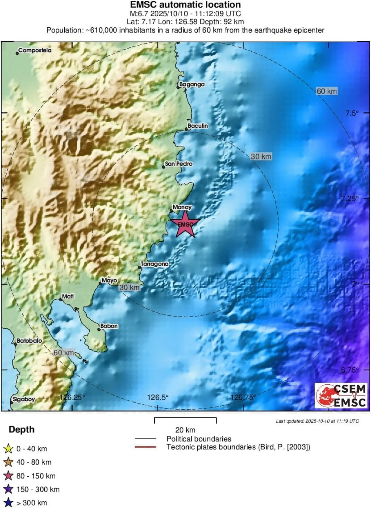 Avrupa-Akdeniz Sismoloji Merkezi, önce 6,8 olarak açıkladığı depremin büyüklüğünü 6,9 olarak güncelledi. Depremin, yine Mindanao adasında gerçekleştiği bildirildi.