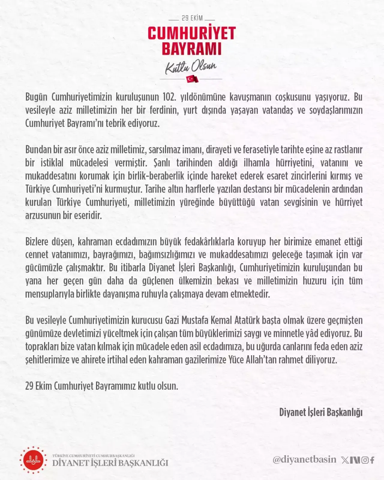 Diyanet İşleri Başkanlığı’nın 29 Ekim Cumhuriyet Bayramı mesajı gündemdeki yerini koruyor. Mesaja dikkat çeken yetkili, Diyanet İşleri Başkanı Safi Arpaguş’a hayırlı olsun ziyaretine gideceğini açıkladı.