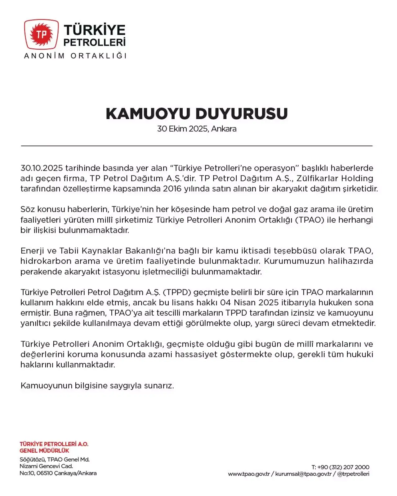 Türkiye Petrolleri Anonim Ortaklığı (TPAO), bazı basın organlarında yer alan “Türkiye Petrolleri’ne operasyon” başlıklı haberler üzerine yazılı açıklama yaptı. Kurum, haberlerde adı geçen şirketin TP Petrol Dağıtım A.Ş. olduğunu, bu şirketin 2016 yılında Zülfikarlar Holding tarafından özelleştirme kapsamında satın alındığını belirtti.