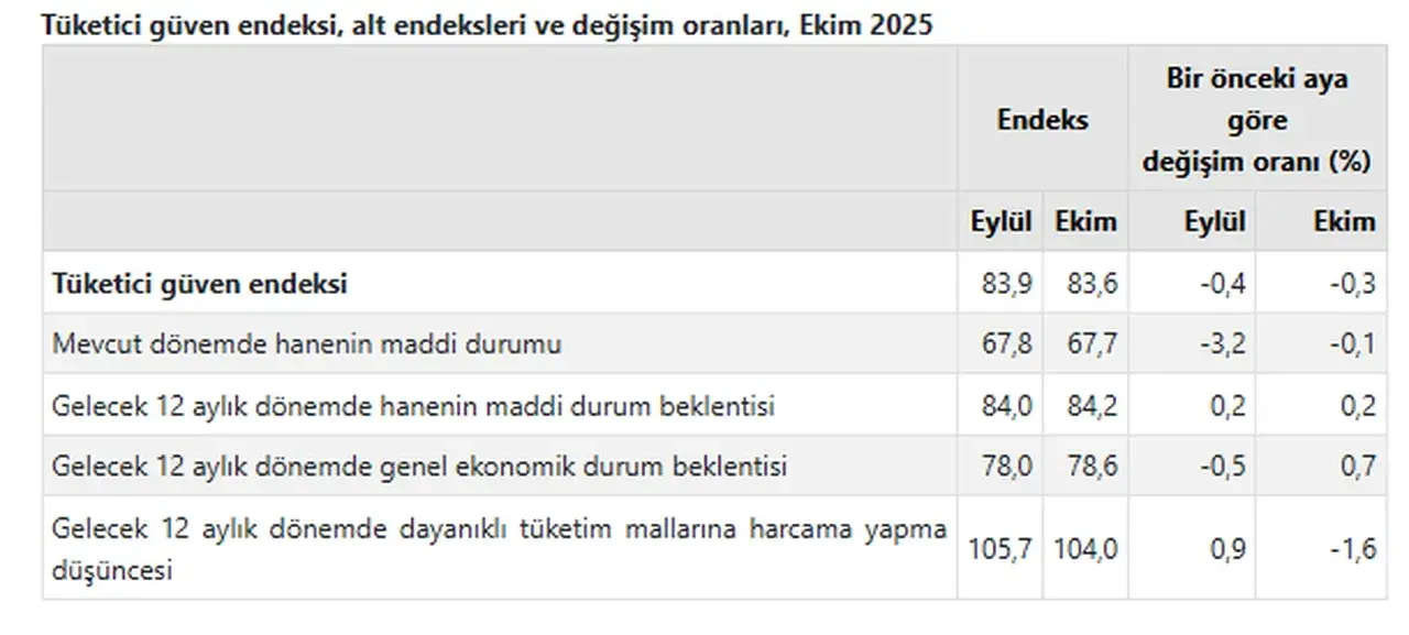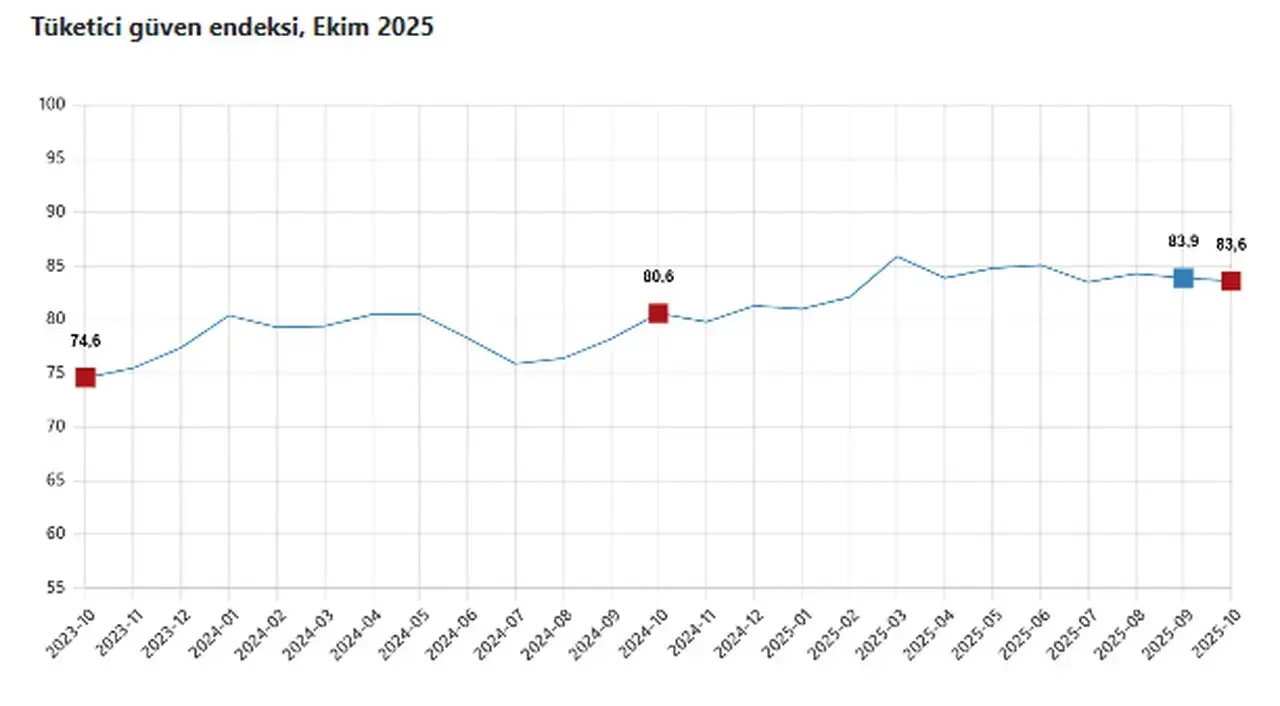 Türkiye İstatistik Kurumu (TÜİK) ve Türkiye Cumhuriyet Merkez Bankası (TCMB) işbirliğiyle yürütülen Tüketici Eğilim Anketi’nin Ekim ayı sonuçları açıklandı. Endeks, Eylül’de 83,9 iken Ekim’de %0,3 azalışla 83,6 olarak kaydedildi.