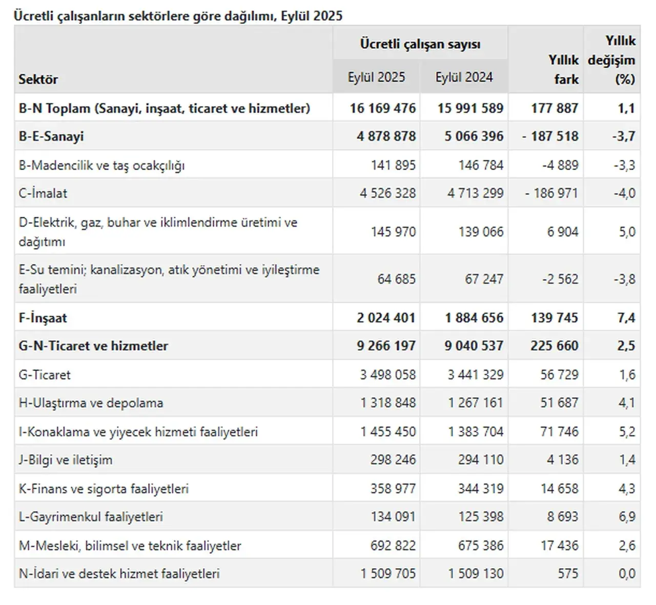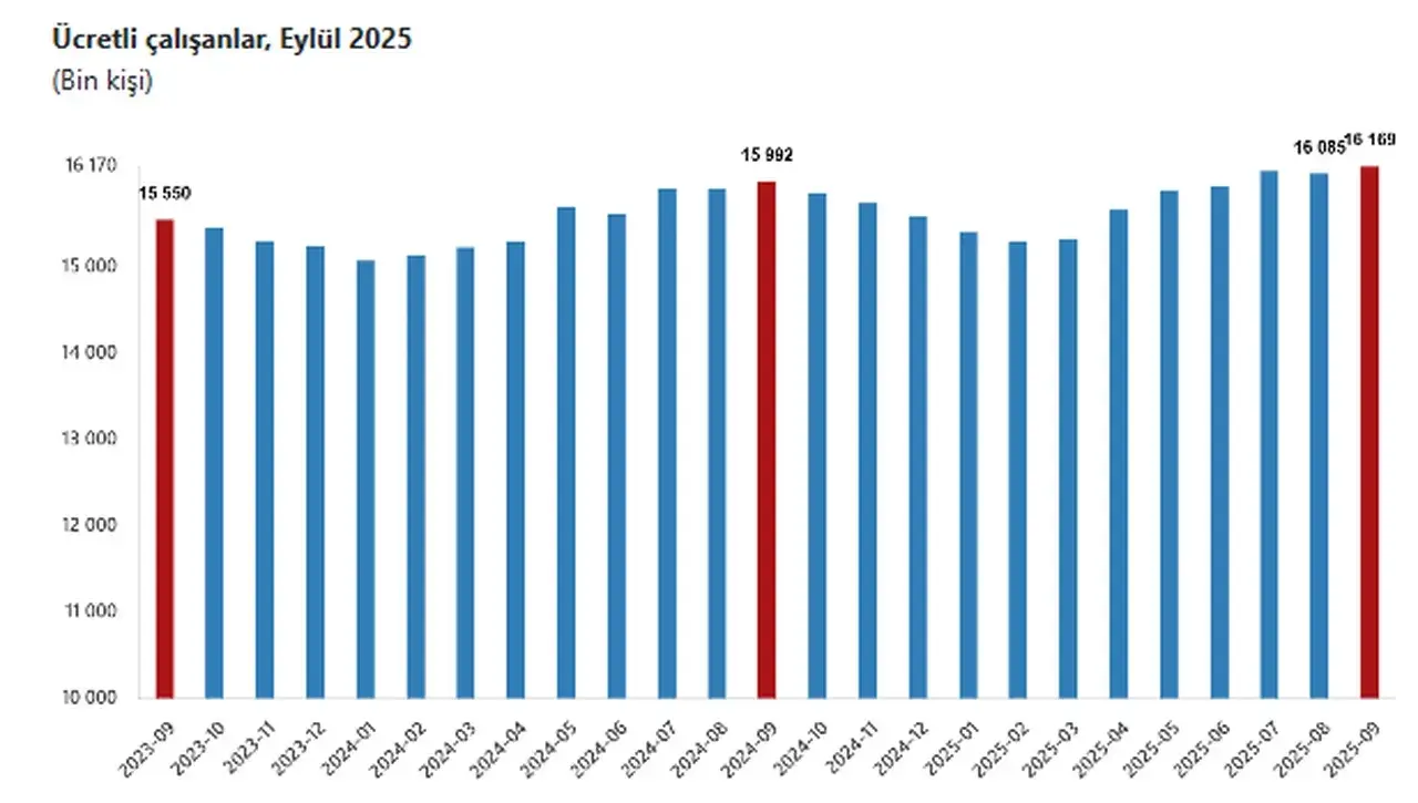 Türkiye İstatistik Kurumu (TÜİK), 2025 yılı Eylül ayı Ücretli Çalışan İstatistikleri’ni yayımladı. Buna göre sanayi, inşaat ve ticaret-hizmet sektörlerinde ücretli çalışan sayısı bir önceki yılın aynı ayına göre %1,1 artarak 16 milyon 169 bin 476 kişiye ulaştı. Geçen yılın Eylül ayında bu sayı 15 milyon 991 bin 589 kişi olarak kaydedilmişti.