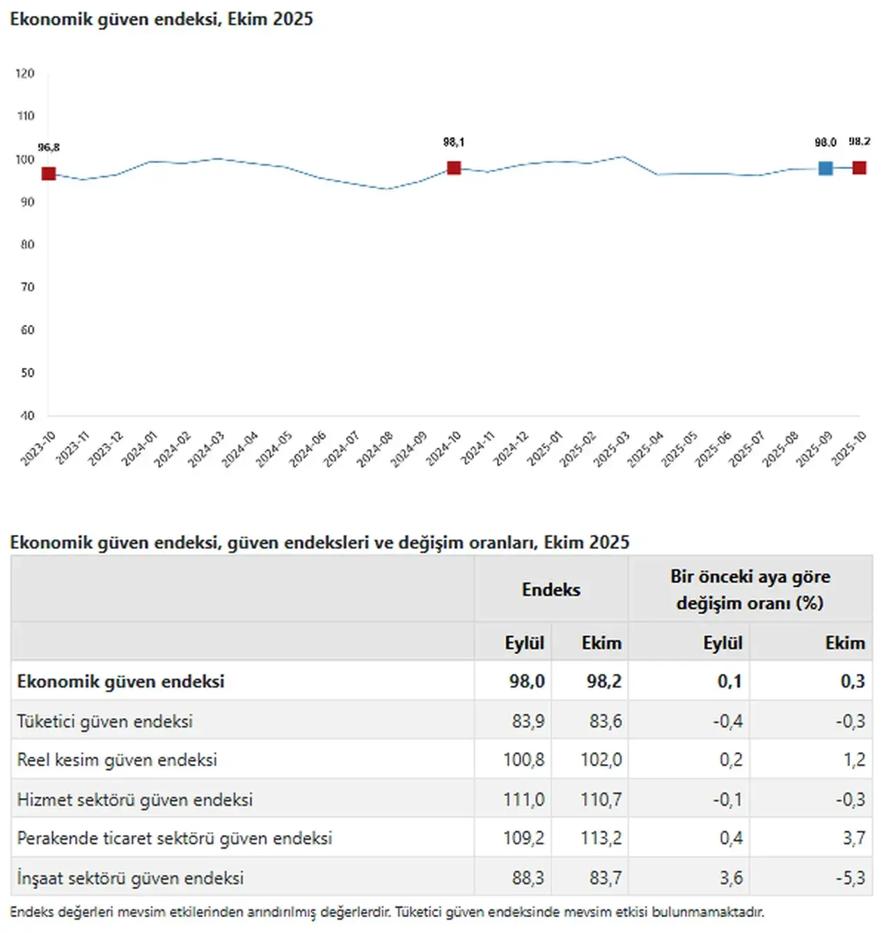 Türkiye İstatistik Kurumu (TÜİK), Ekim ayına ilişkin Ekonomik Güven Endeksi verilerini açıkladı. Buna göre endeks, Eylül’de 98,0 seviyesindeyken Ekim’de yüzde 0,3 artışla 98,2 değerine ulaştı.