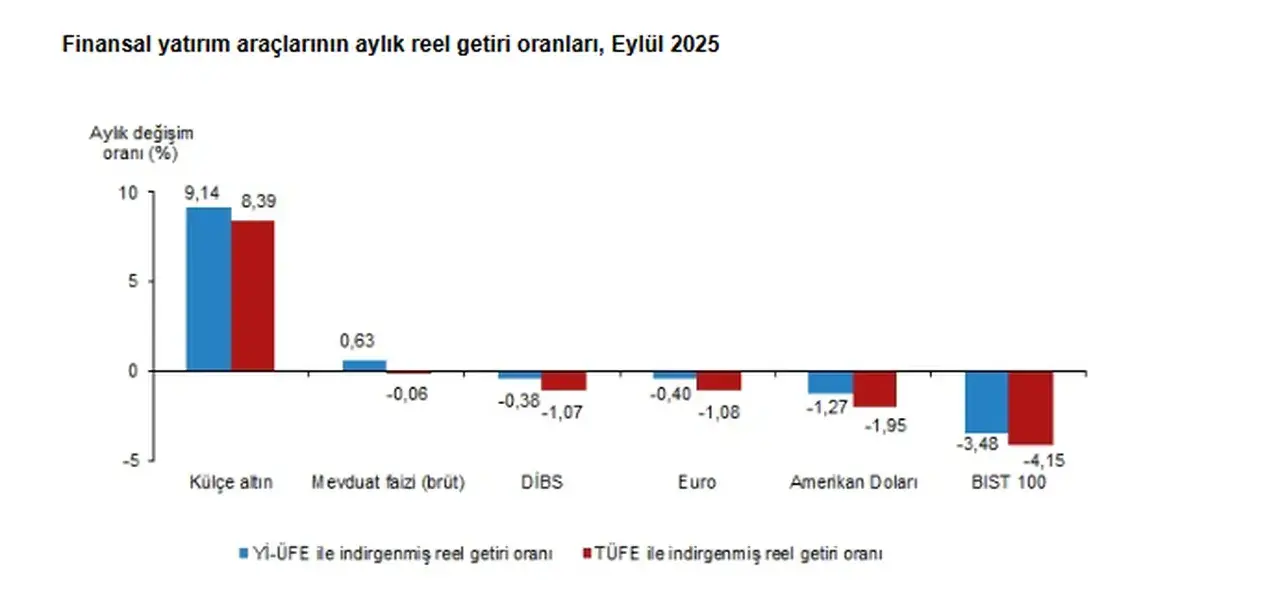 Eylül 2025 verilerine göre külçe altın, en yüksek reel getiri oranıyla yatırımcılarına kazandırdı. Yİ-ÜFE ile indirgendiğinde %9,14, TÜFE ile %8,39 oranında artış gösterdi.