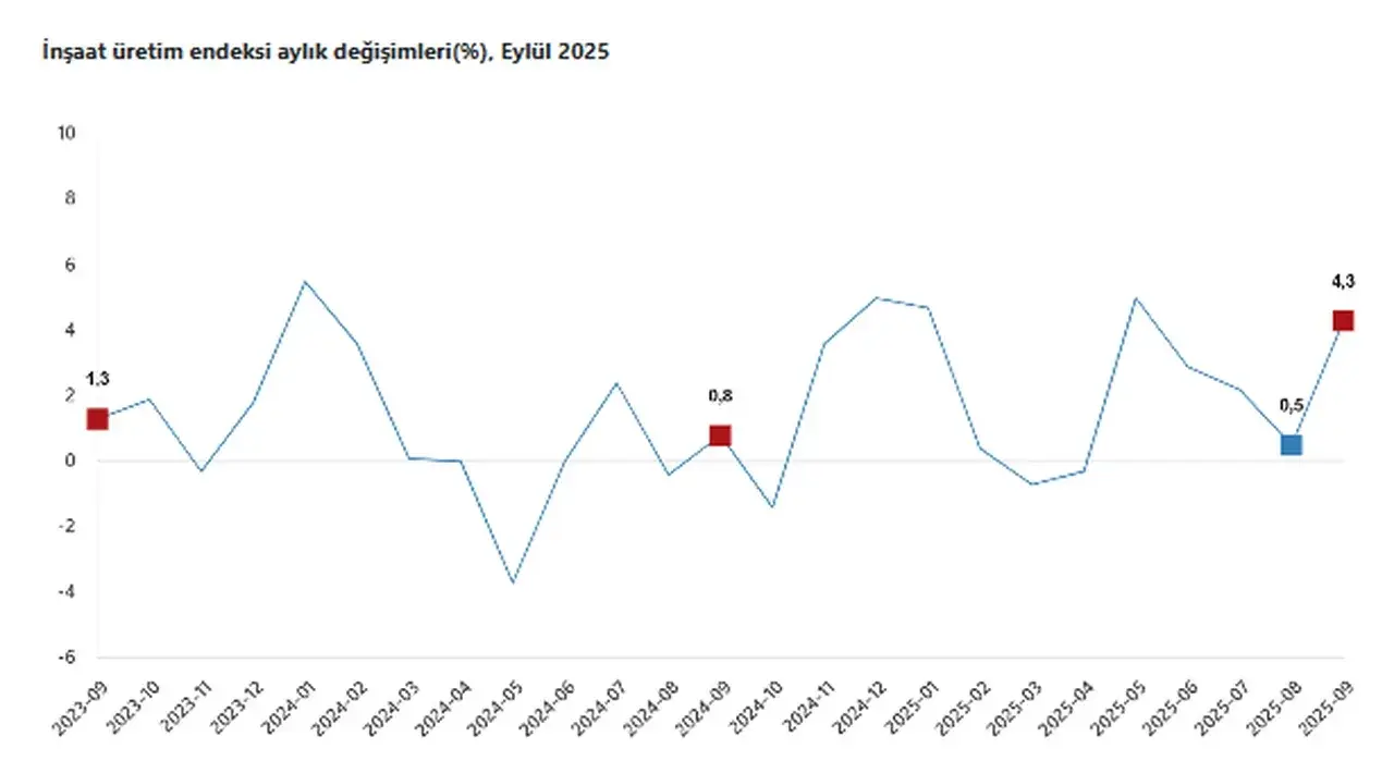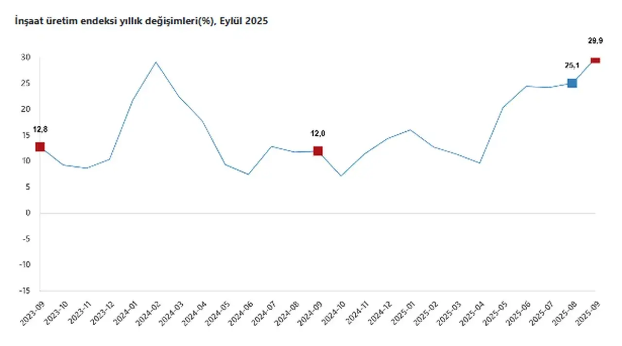 Türkiye İstatistik Kurumu (TÜİK), 2025 yılı Eylül ayına ilişkin İnşaat Üretim Endeksi verilerini açıkladı. Buna göre inşaat üretimi, geçen yılın aynı dönemine göre %29,9 artış gösterdi.