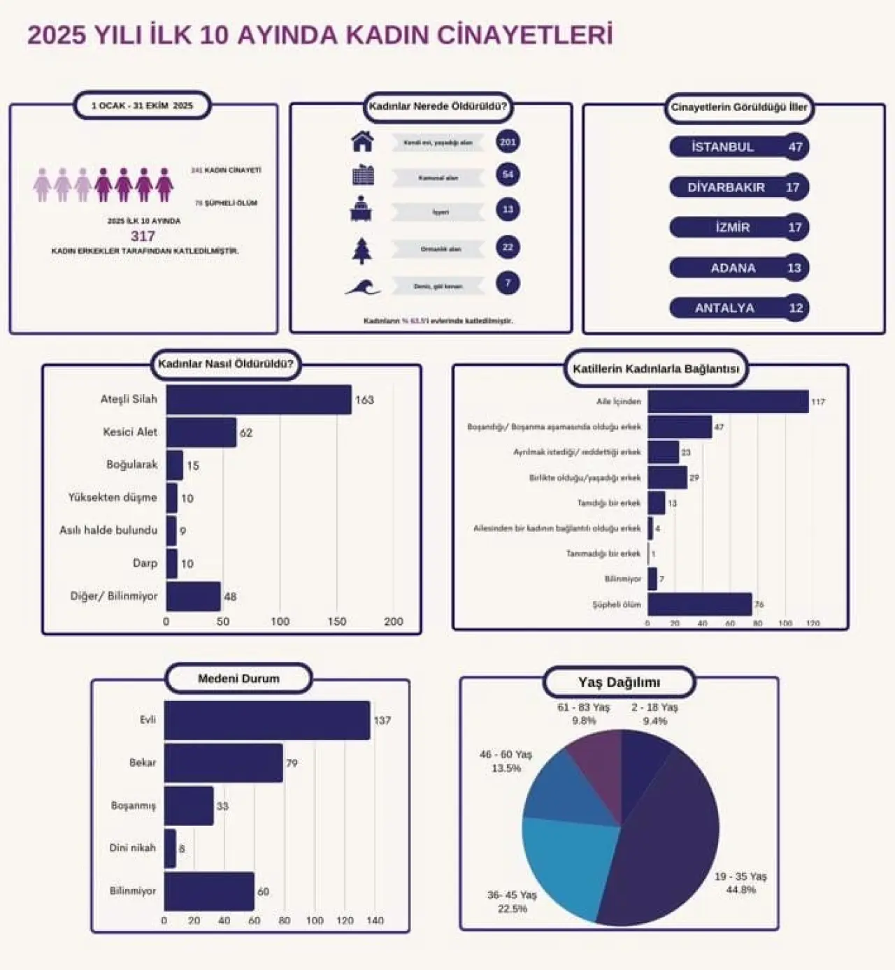 Yılın ilk 10 ayında toplam 317 kadın erkekler tarafından öldürüldü. Bunlardan 241’i kadın cinayeti, 76’sı ise şüpheli ölüm olarak kayıtlara geçti. Cinayetlerin yüzde 63,5’i kadınların kendi evlerinde işlendi. En fazla vakaların görüldüğü iller İstanbul, Diyarbakır, İzmir, Adana ve Antalya oldu.