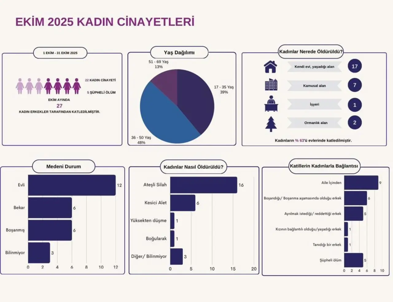 Türkiye Kadın Dernekleri Federasyonu’nun raporuna göre yalnızca ekim ayında 27 kadın erkekler tarafından öldürüldü, 5 kadının ölümü şüpheli kaldı. 2025’in ilk 10 ayında ise toplam 317 kadın yaşamını yitirdi; cinayetlerin büyük bölümü ev içinde işlendi.