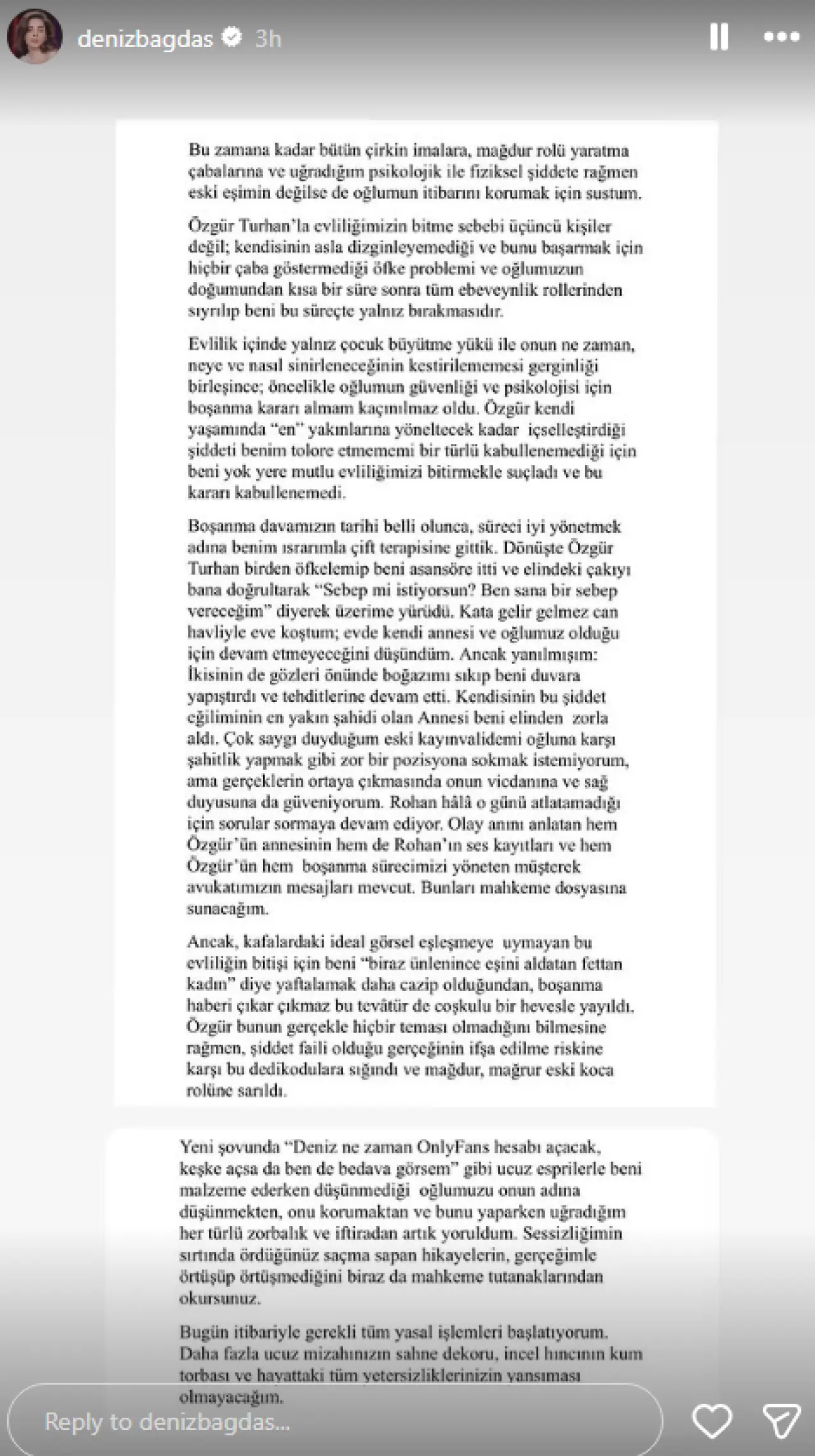 "Yeni şovunda 'Deniz ne zaman OnlyFans hesabı açacak, keşke açsa da ben de bedava görsem' gibi ucuz esprilerle beni malzeme ederken düşünmediği oğlumuzu onun adına düşünmekten, onu korumaktan ve bunu yaparken uğradığım her türlü zorbalık ve iftiradan artık yoruldum. Sessizliğimin sırtında ördüğünüz saçma sapan hikayelerin, gerçeğimle örtüşüp örtüşmediğini biraz da mahkeme tutanaklarından okursunuz.