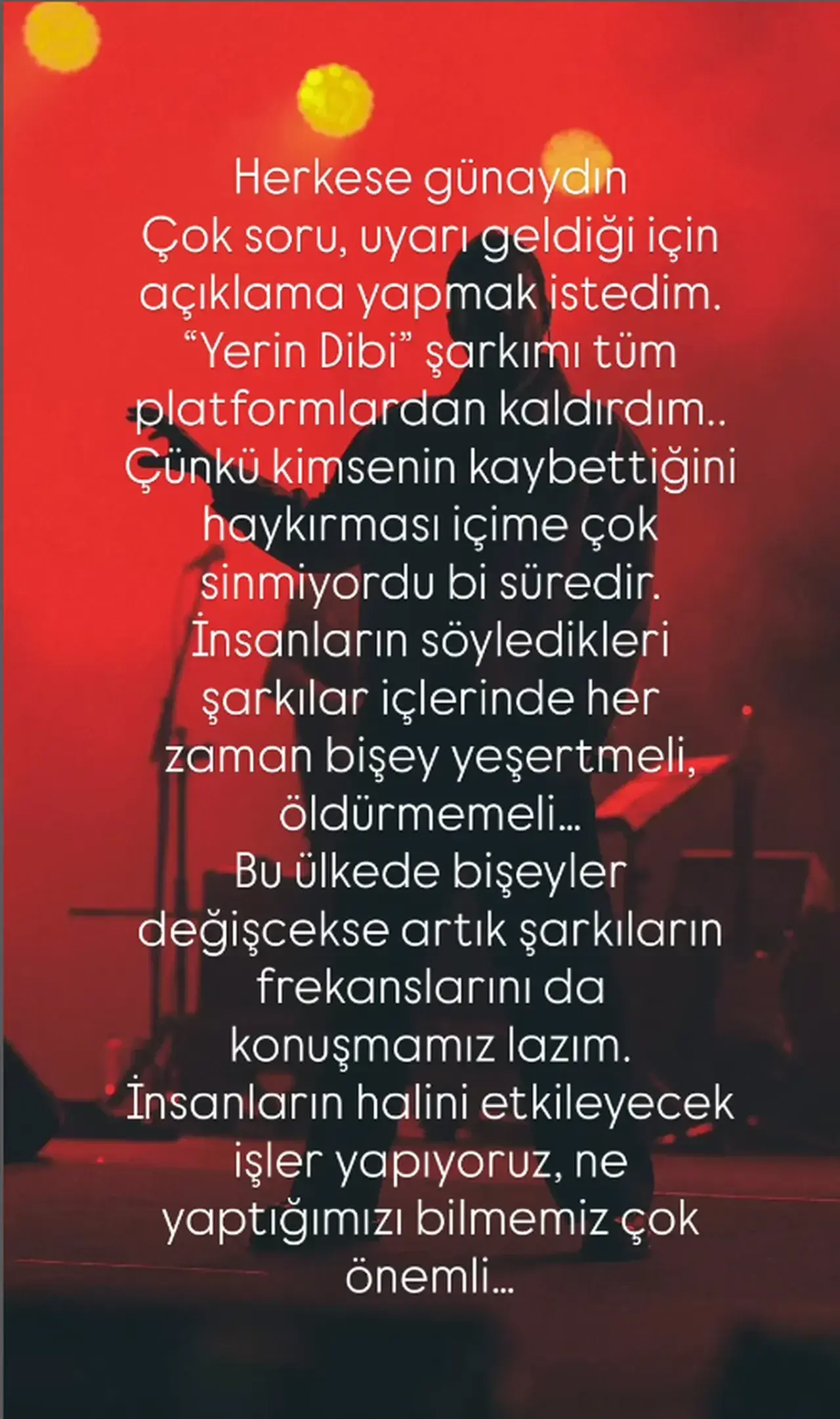 Dalkılıç, sosyal medya hesabından şu açıklamayı yaptı: “Herkese günaydın, çok soru ve uyarı aldım, o yüzden açıklama yapmak istedim. ‘Yerin Dibi’ şarkımı tüm platformlardan kaldırdım... Çünkü kimsenin kaybettiğini haykırması içime sinmiyordu bi süredir. İnsanların söyledikleri şarkılar içlerinde her zaman bir şey yeşertmeli, öldürmemeli... Bu ülkede bir şeyler değişecekse artık şarkıların frekanslarını da konuşmamız lazım. İnsanların halini etkileyecek işler yapıyoruz, ne yaptığımızı bilmemiz çok önemli.”