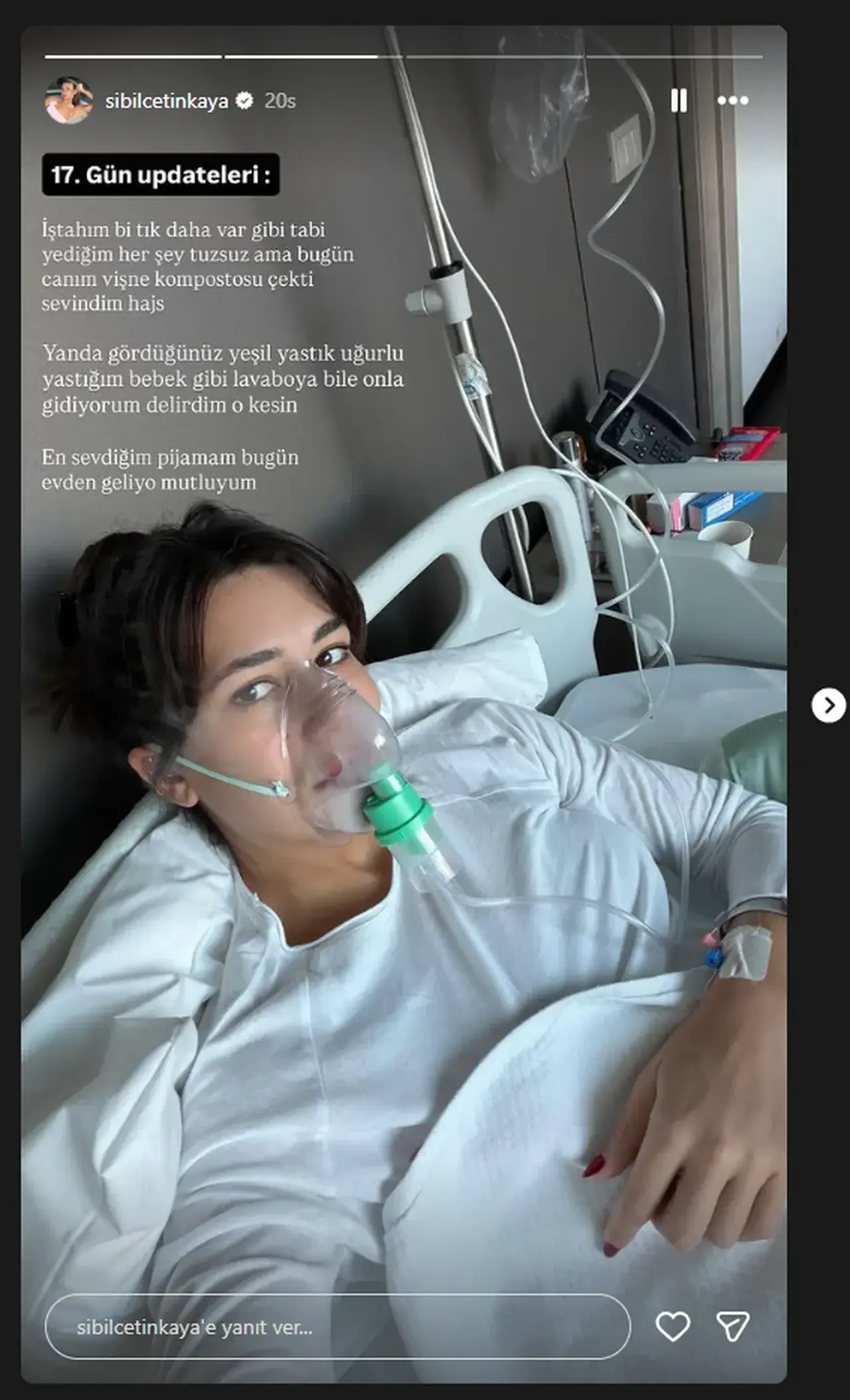 Son olarak Instagram hesabından yaptığı paylaşımla takipçilerine moral veren Çetinkaya, sağlık durumunun iyiye gittiğini belirtti. Ünlü fenomen, “İştahım bi tık daha var gibi. Tabi yediğim her şey tuzsuz ama bugün canım vişne kompostosu çekti, sevindim. Yanımdaki yeşil yastık uğurlu yastığım, lavaboya bile onla gidiyorum, delirdim o kesin. En sevdiğim pijamam da evden geliyor, mutluyum.” ifadelerini kullandı.