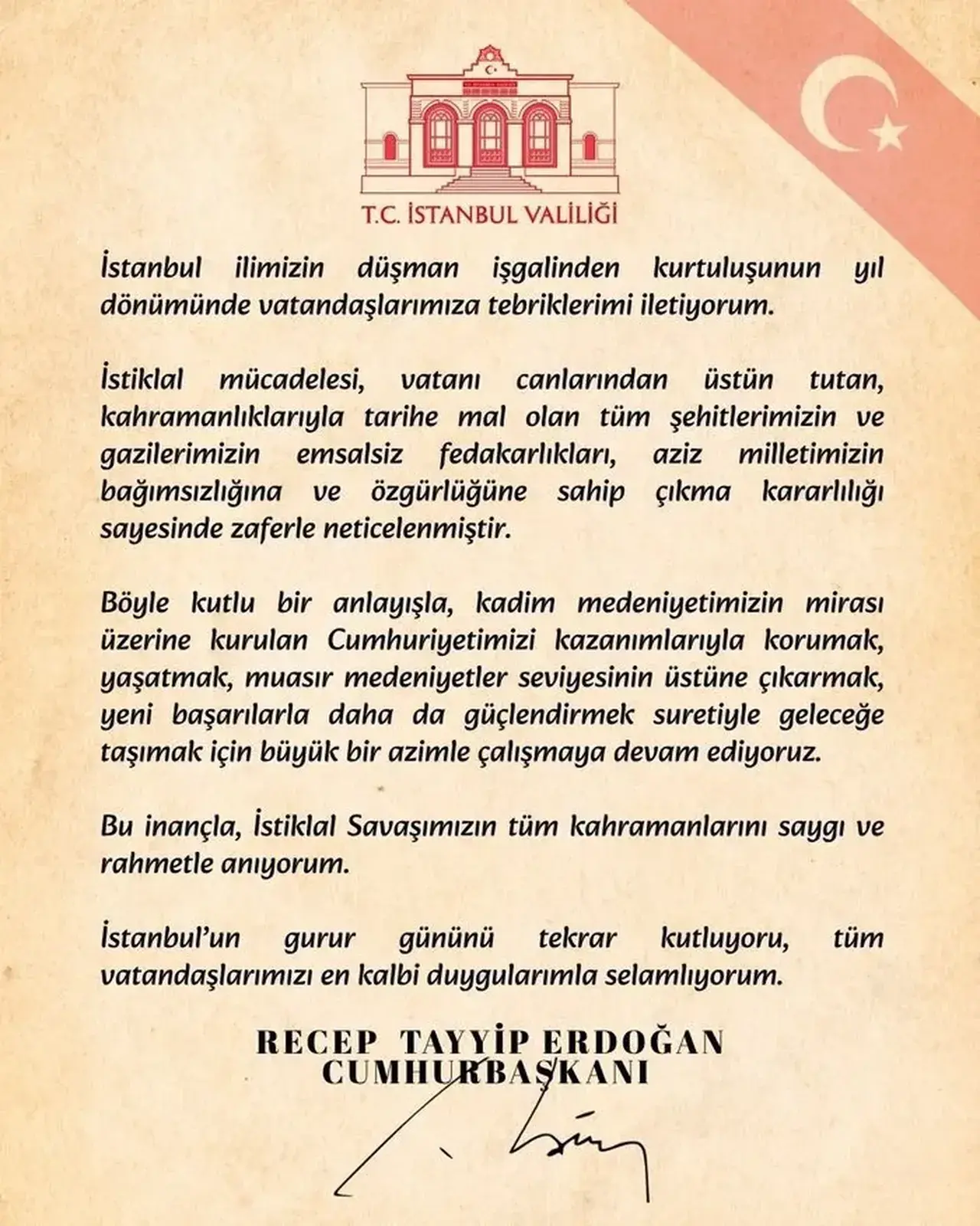 Böyle kutlu bir anlayışla, kadim medeniyetimizin mirası üzerine kurulan Cumhuriyetimizi kazanımlarıyla korumak, yaşatmak, muasır medeniyetler seviyesinin üstüne çıkarmak, yeni başarılarla daha da güçlendirmek suretiyle geleceğe taşımak için büyük bir azimle çalışmaya devam ediyoruz. Bu inançla, İstiklal Savaşımızın tüm kahramanlarını saygı ve rahmetle anıyorum. İstanbul'un gurur gününü tekrar kutluyorum, tüm vatandaşlarımızı en kalbi duygularımla selamlıyorum."