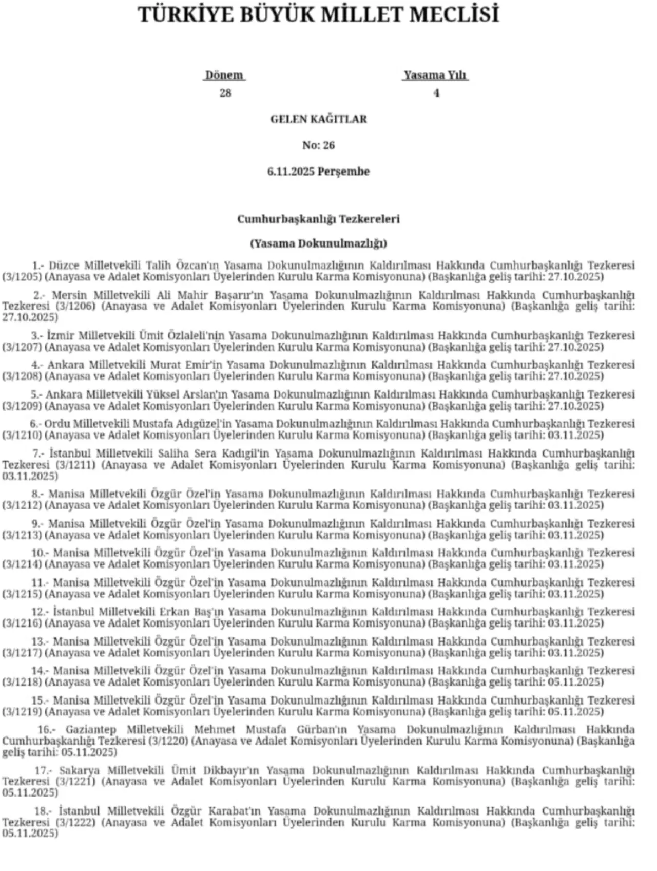 Türkiye Büyük Millet Meclisi (TBMM) Başkanlığına, aralarında CHP Genel Başkanı Özgür Özel ve TİP Genel Başkanı Erkan Baş’ın da bulunduğu 12 milletvekili hakkında hazırlanan 18 dokunulmazlık dosyası sunuldu.