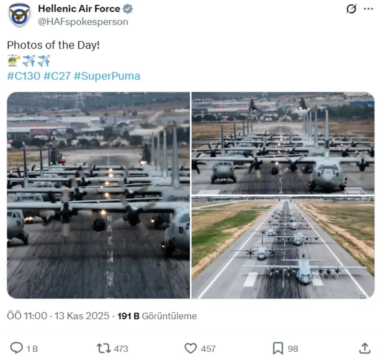 11 Kasım’daki kazanın ardından Milli Savunma Bakanlığı’nın acı haberi duyurmasıyla birlikte Yunanistan Hava Kuvvetleri, sosyal medya hesabında “Günün Fotoğrafları! #C130 #C27 #SuperPuma” notuyla C130 uçaklarının yer aldığı bir görsel paylaştı. Paylaşım kısa sürede sosyal medyada tepki yağmuruna tutuldu.
